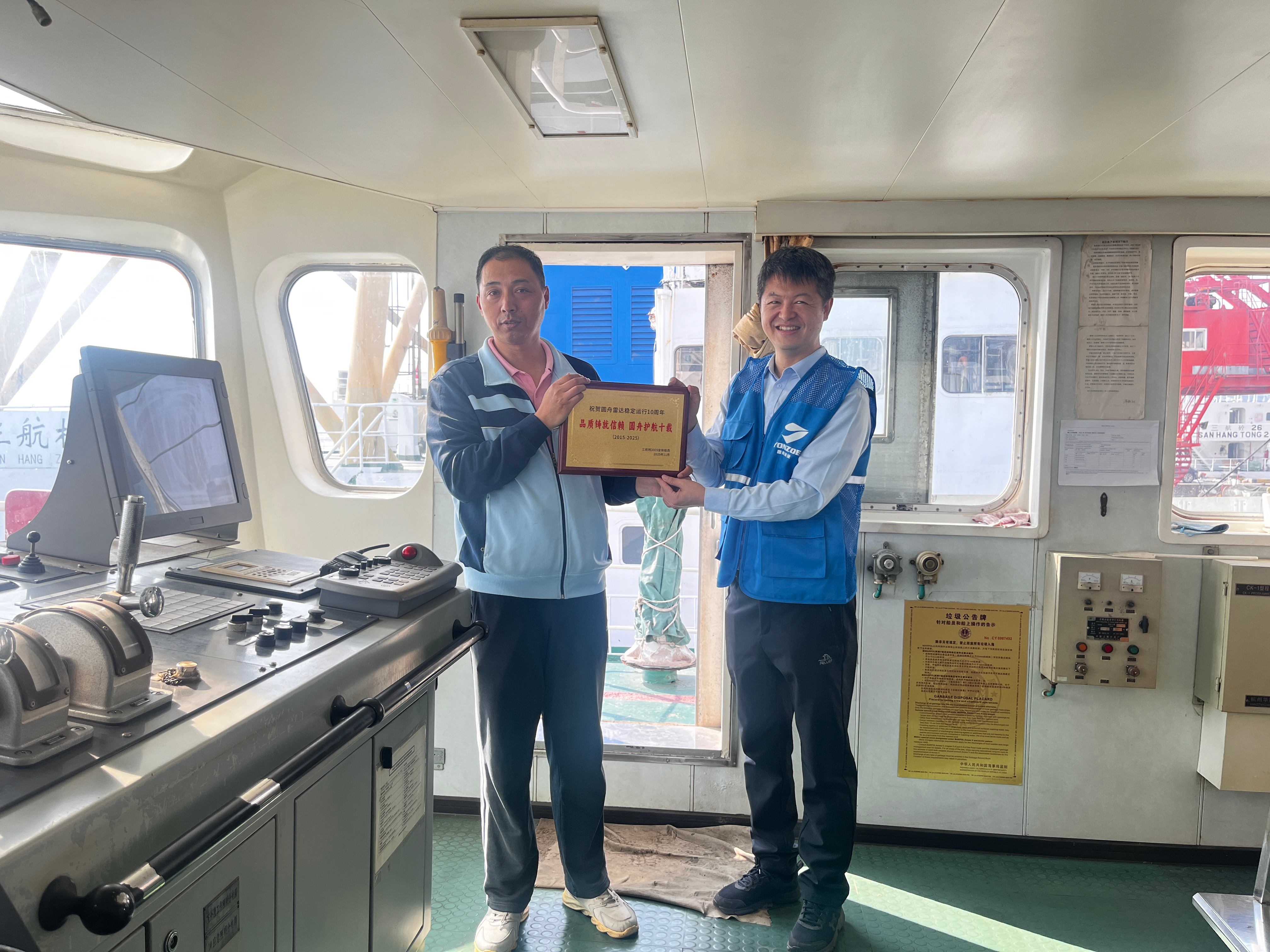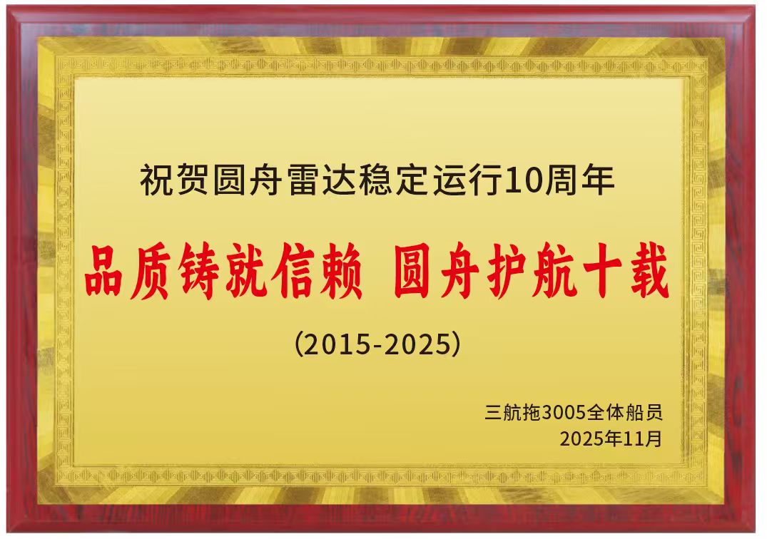 2025年12月11日,上海圆舟科技与中交三航局3005拖轮班组齐聚甲板,共同为一部特殊的船用雷达庆贺“十岁生辰”。这部意义非凡的雷达,是圆舟科技2015年取得CCS证书后船载安装的首部产品,十年来始终伴船搏击风浪,在恶劣海工环境中圆满完成了一次又一次作业任务。
